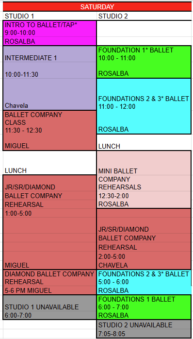 - Saturday September 6: Nutcracker rehearsals begin (Mini Company 12:30-2:00 pm) (Diamond Company rehearsal start date TBA) (Jr/Sr Company rehearsal schedule will be emailed)